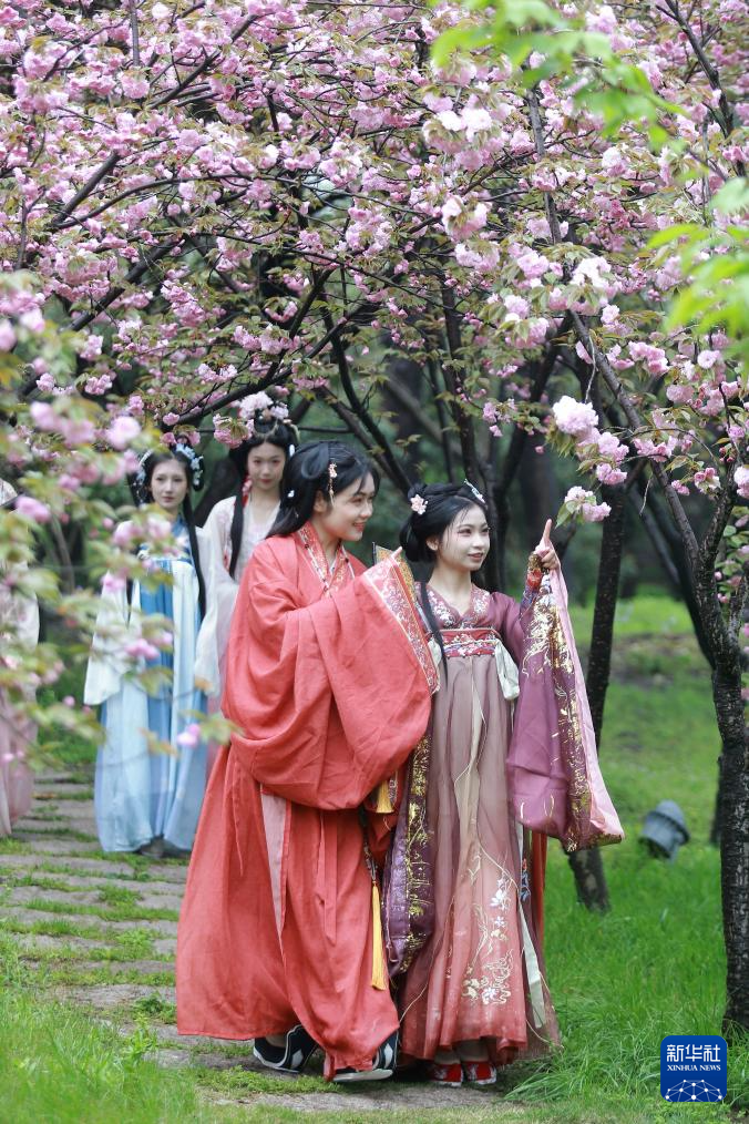 4月8日,游客在江苏扬州瘦西湖风景区赏花拍照。