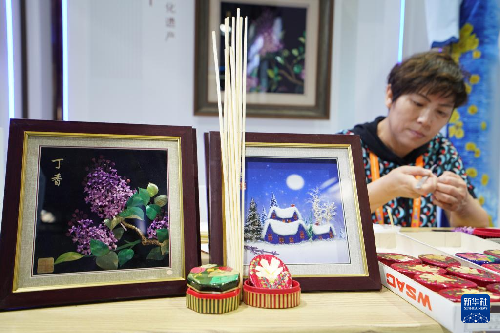 这是4月14日在国货特色潮品展区黑龙江展台拍摄的麦秆剪贴艺术品。