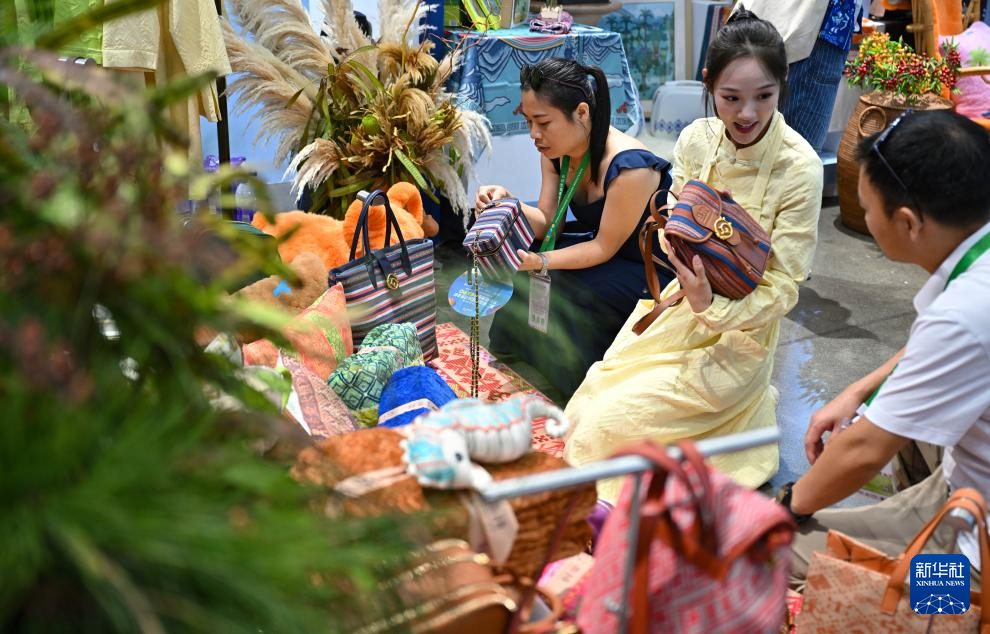 4月13日,观众在消博会现场选购设计融入海南黎族服饰元素的生活用品。