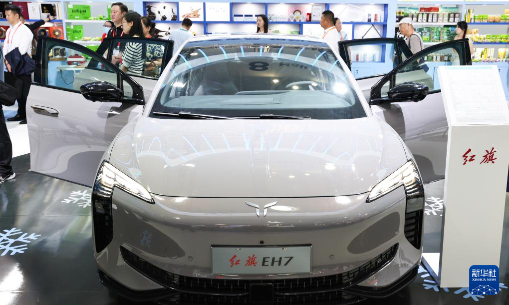这是4月13日拍摄的在消博会上展出的红旗新能源汽车。