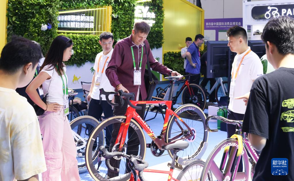 4月14日,观众在参观泰山体育展出的碳纤维自行车。