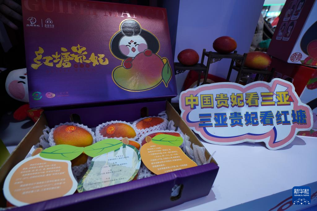 这是4月14日在国货特色潮品展区拍摄的“唐妞驾到红塘贵妃芒”。这是“唐妞”卡通形象与三亚红塘湾本土水果贵妃芒联名推出的产品。