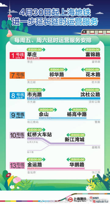 为进一步提升上海地铁线网夜间服务水平,自2024年4月30日起,所有六条延时运营线路延时末班车始发时间均调整至次日0点,上述六条线路的延时运营区段均保持不变。延时期间,各换乘站实施自然换乘,请需要换乘的乘客注意换乘相关线路的末班车时间。