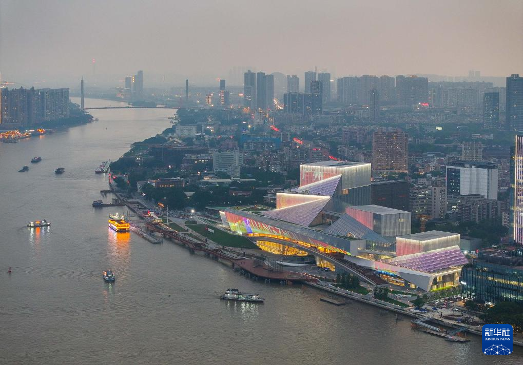 霞光映照下的白鹅潭大湾区艺术中心(4月27日摄)。