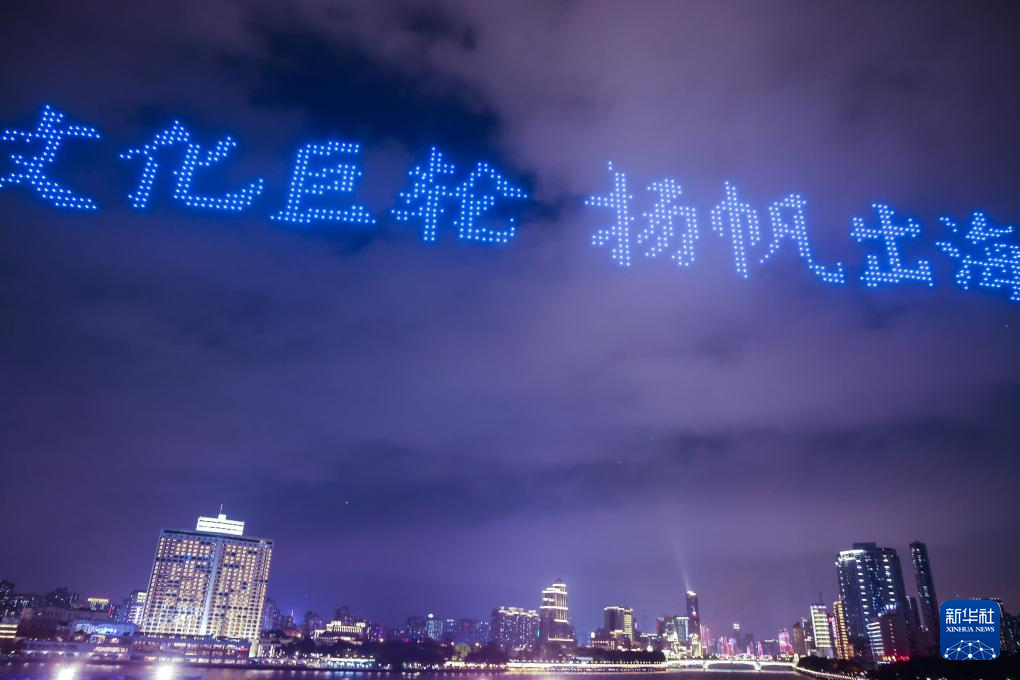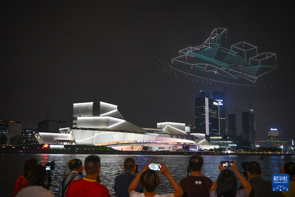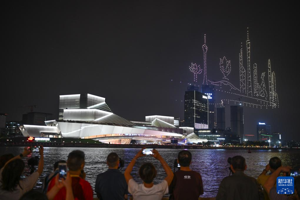 4月28日拍摄的白鹅潭大湾区艺术中心无人机表演。