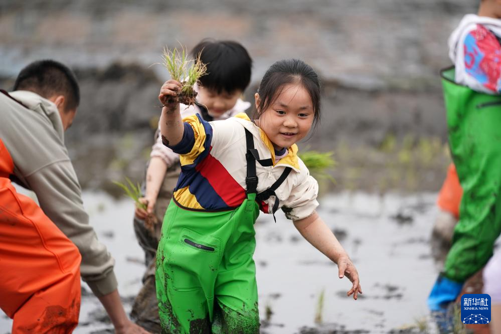 5月4日,在太原市晋源区晋祠镇北大寺村的稻田里,小朋友在体验插秧。