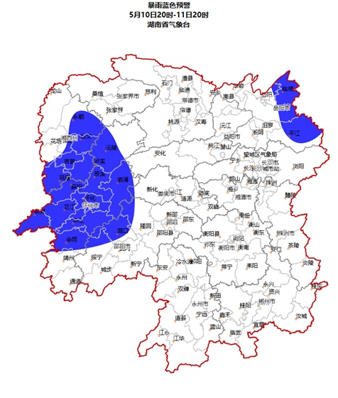 湖南省气象台5月10日16时发布暴雨蓝色预警:
