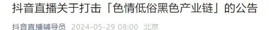 2024年以来,抖音直播平台处罚涉及色情低俗行为的账号超过200万个,对超过8万个涉“软色情”账号回收直播权限,无限期回收直播权限超4万个账号。累计输出相关线索9条,移交警方数起涉色情低俗违法案件,共抓捕嫌疑人11名。