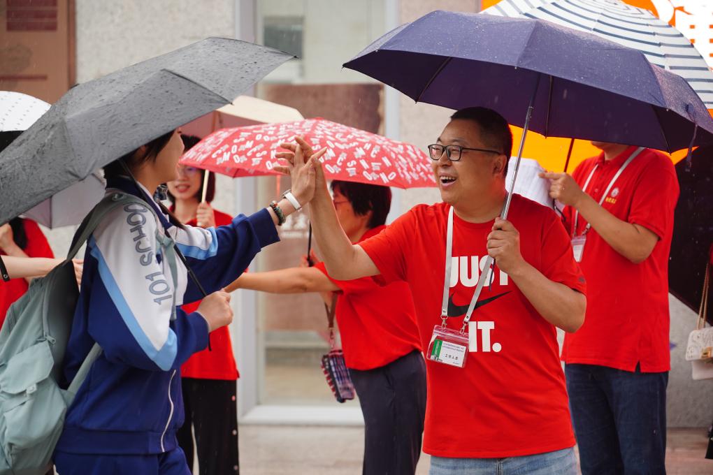 虽然天空下着雨,北京一零一中学的送考老师们还是早早在校门口排成一列,与陆续赶来的考生一一击掌鼓劲。在校门口刷脸验证身份后,考生通过提前搭设的红色晴雨走廊,步入候考区及考场。