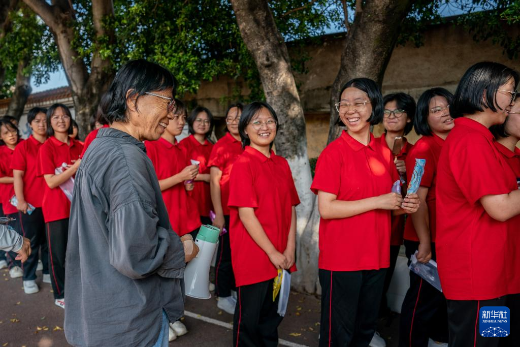 6月7日,张桂梅带着低年级学生给准备出发参加高考的同学们加油鼓劲。