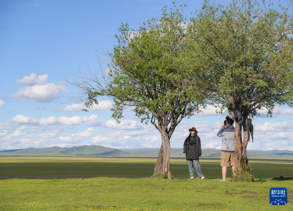 6月8日,游客在四川省阿坝藏族羌族自治州红原县日干乔湿地观光留影。