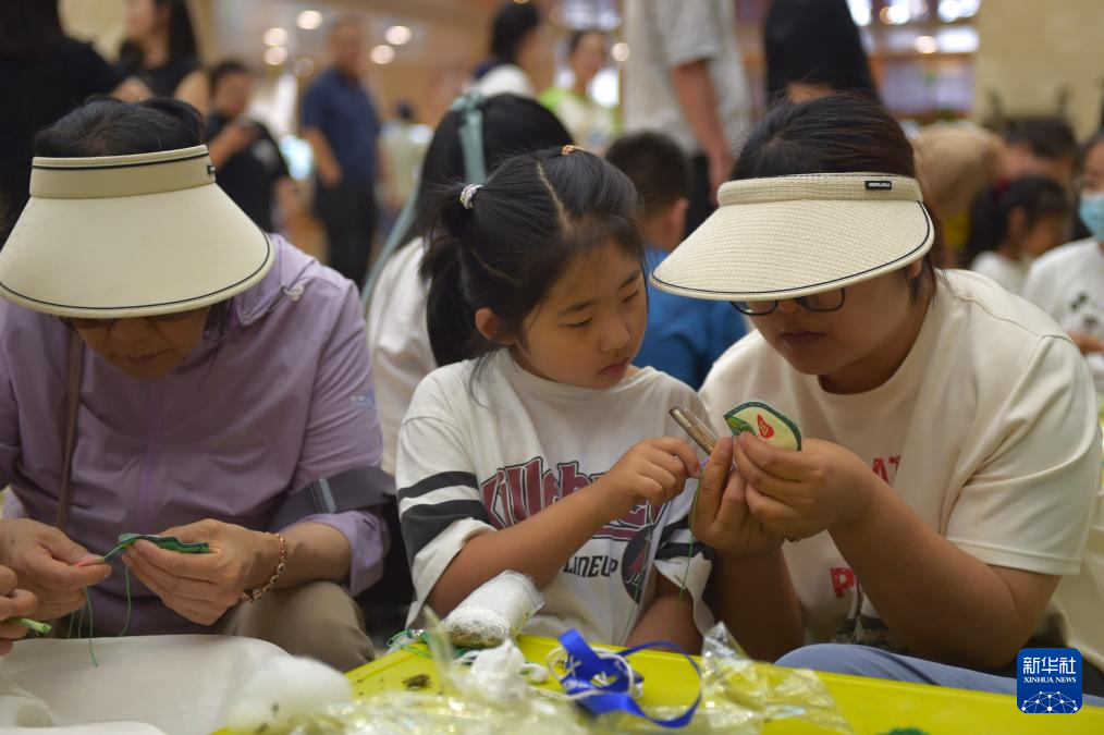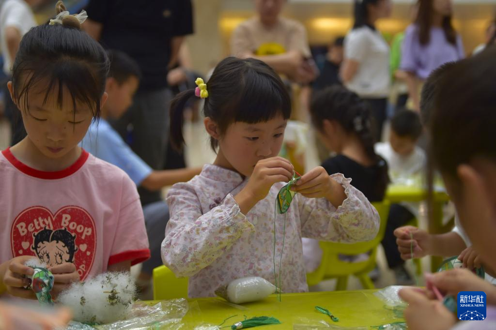 6月9日,小朋友和家人在位于银川的宁夏博物馆制作艾草香包。