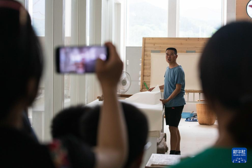 6月9日,一名晒纸工在位于安徽省宣城市泾县的中国宣纸文化园内向游客介绍宣纸制作技艺。