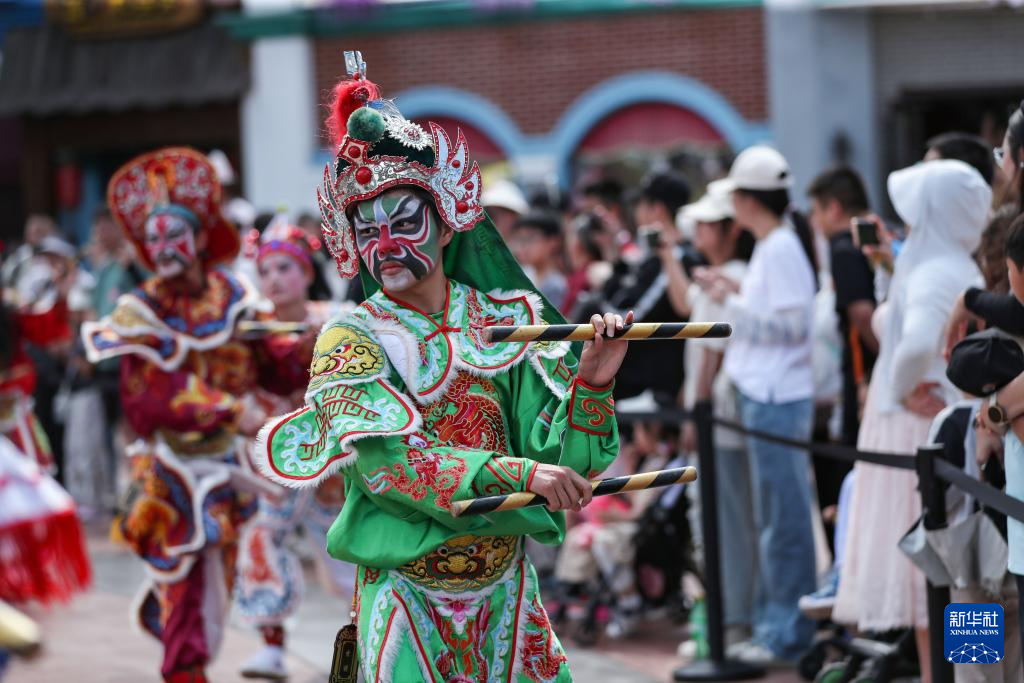 6月9日,游人在沈阳方特欢乐世界观看英歌舞表演。