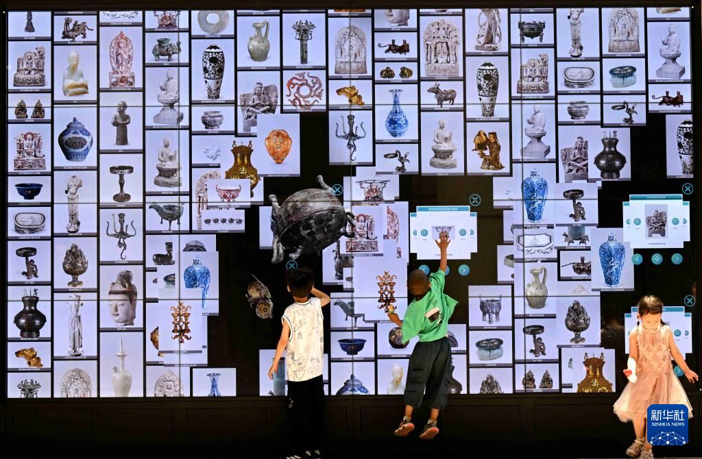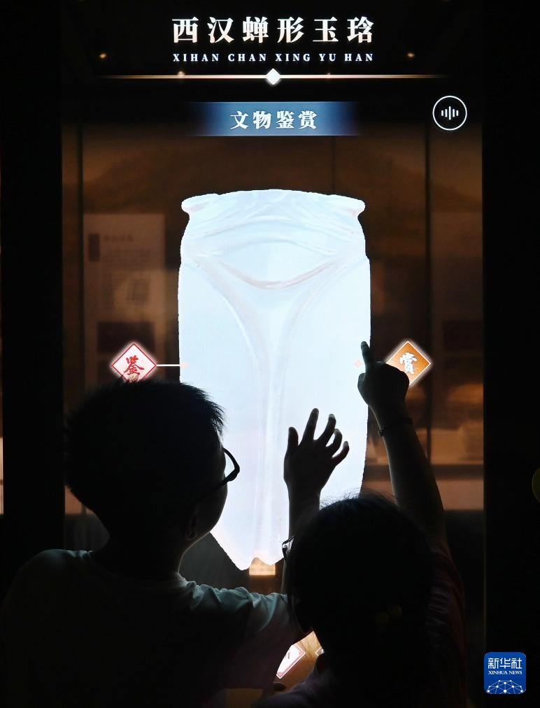 6月9日,小朋友在山东省滕州汉画像石馆内体验文物数字化展示。