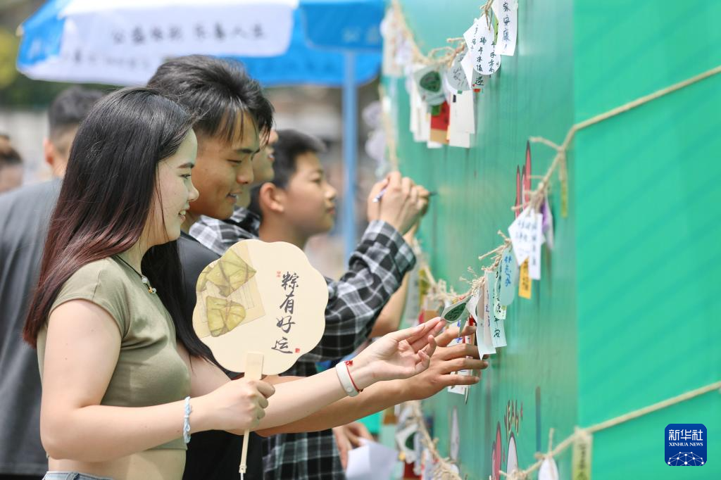 6月9日,在浙江省嘉兴市南湖区子城遗址公园,市民在端午“祈福墙”上挂心愿符。