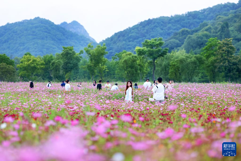 6月8日,游人在浙江省杭州市西湖区双浦镇铜鉴湖畔的花海中游览。
