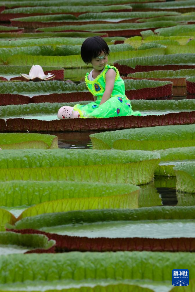 6月9日,在中国科学院西双版纳热带植物园内,小朋友坐在巨大的王莲叶片上体验“一叶当舟”。