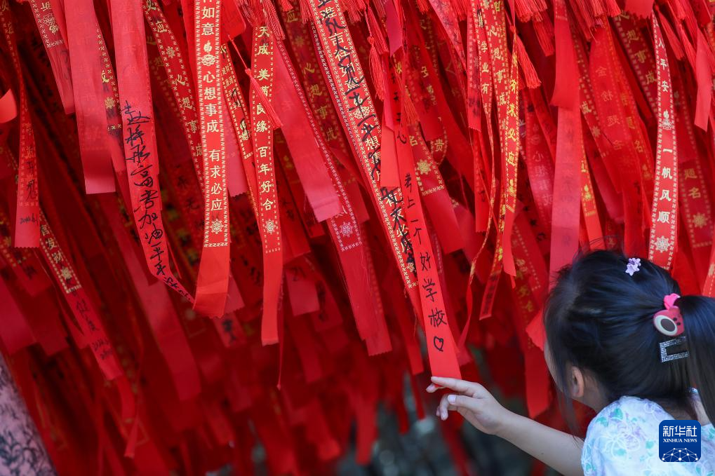 6月9日,在河南省商丘古城一颗挂满许愿红绸的许愿树下,一名小游客在观看愿望签。