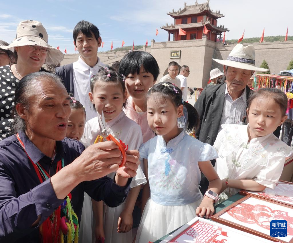 6月9日,剪纸艺人在位于甘肃省白银市会宁县的红军会宁会师旧址景区为游客展示剪纸技艺。