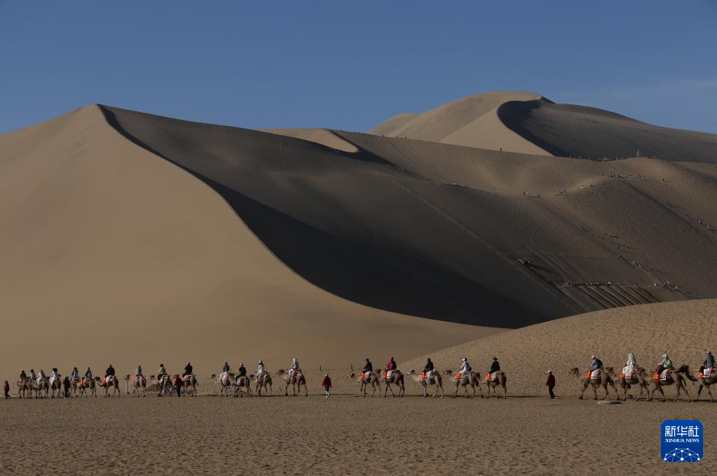 6月9日,游客在甘肃省敦煌市鸣沙山月牙泉景区游览。