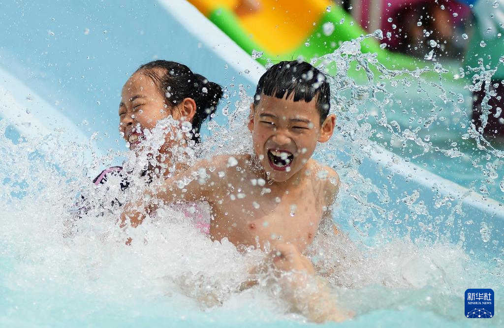 6月9日,小朋友在山东省滕州市一家水上乐园戏水。