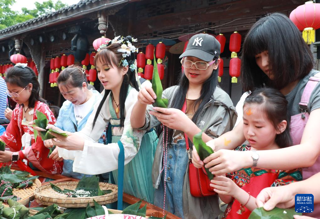 6月8日,游客在四川省成都市彭州市海窝子古镇体验包粽子。