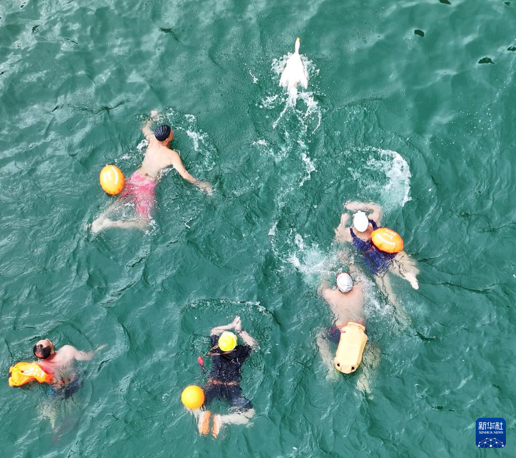 6月9日,四川省南充市蓬安县游泳爱好者在嘉陵江上抢鸭子(无人机照片)。