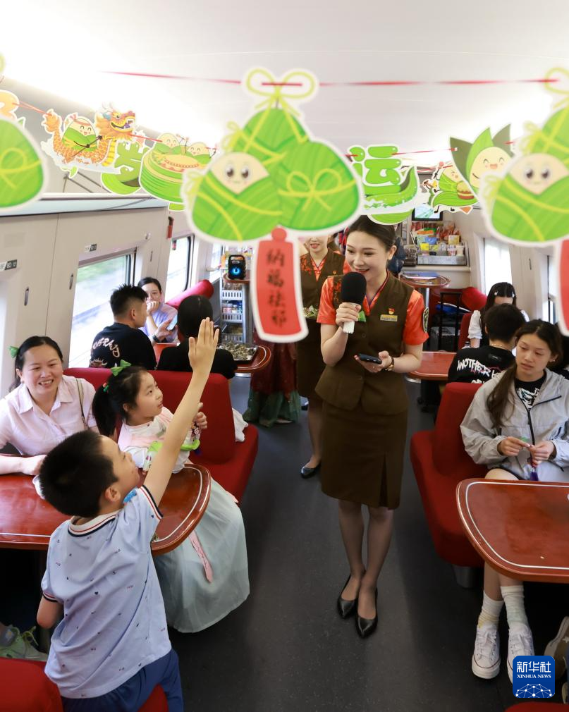 6月9日,武汉客运段在G883次列车上举办“‘粽’享高铁情 温馨端午行”主题活动,乘务员和旅客进行互动游戏。