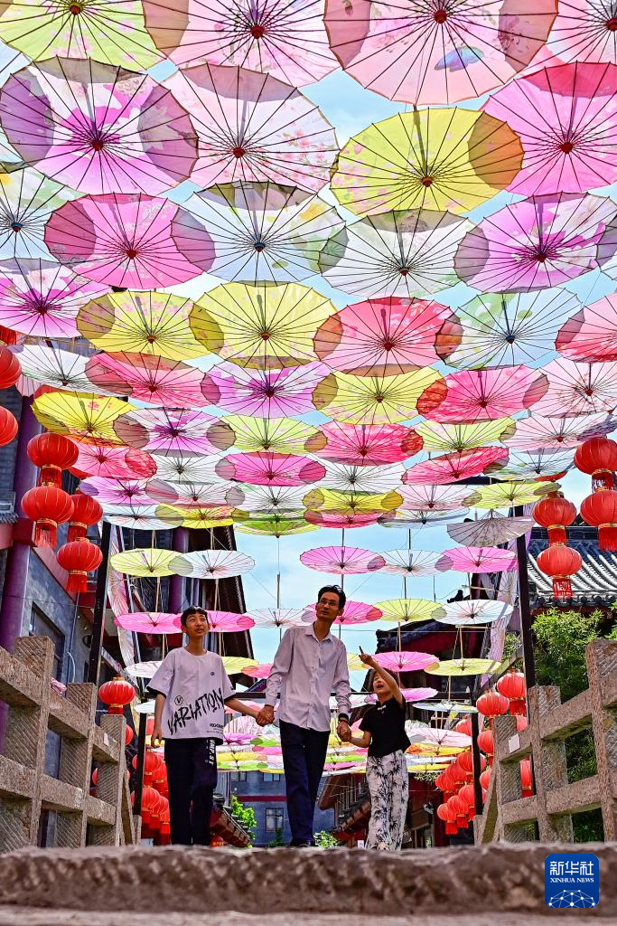 6月9日,游客在山东省青州市宋城赏景游玩。