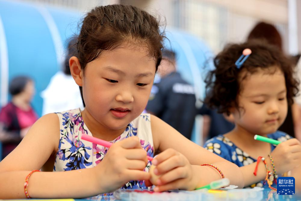 6月9日,在山东省枣庄市文化路街道市府社区,小朋友在参加画彩蛋比赛。