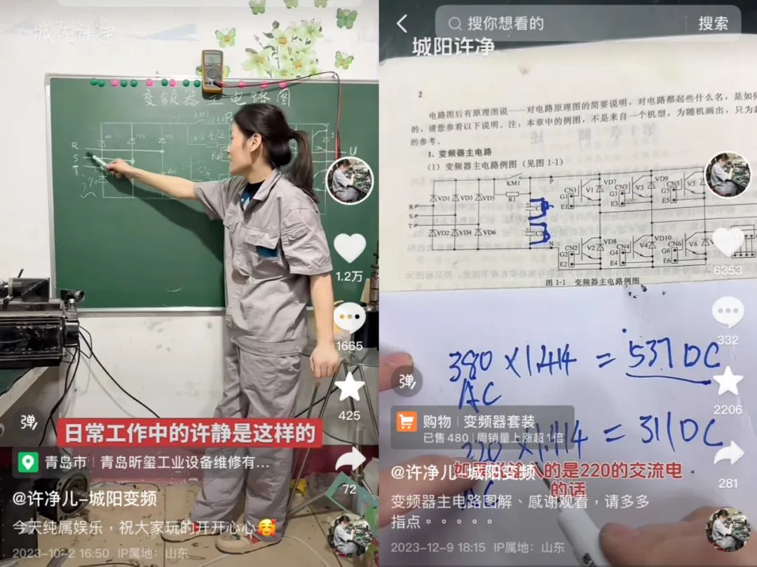 回声迅猛又热烈,许净异常惊诧。2021年,她在抖音注册了一个账号@许净儿-城阳变频,起初只是抱着招徕生意的想法,随意分享工作日常。一些电工同行也在这么做。但因为变频器行业过于小众,她本不抱什么期待。长达一年的时间里,她的视频播放量也只有几百。