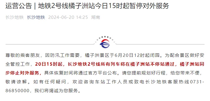 尊敬的乘客朋友,因防汛工作需要,橘子洲景区于6月20日12时起闭园。为配合景区做好安全管控工作,20日15时起,长沙地铁2号线所有列车将在橘子洲站不停站通过,橘子洲站同步停止对外服务,具体恢复时间将通过官方平台公布。请您提前规划好行程,给您带来不便,敬请谅解。如有任何疑问,欢迎咨询车站工作人员或致电长沙地铁客服热线0731-86850000,我们将竭诚为您服务。
