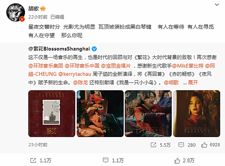剧集《繁花》官方微博在6月21日下午发布了音乐专辑相关信息,并表示:“这不仅是一场音乐的再生,也是时代的回顾与对《繁花》大时代背景的致敬!”胡歌、唐嫣、辛芷蕾、陈龙等人也转发此微博。
