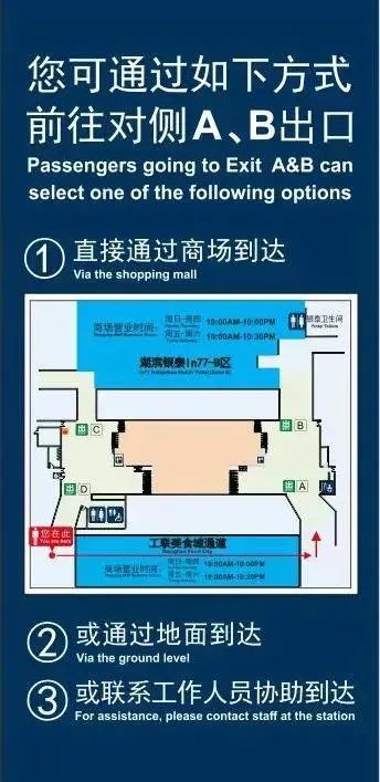 如乘客在A、B出入口需要使用卫生间,可关注现场引导标识前往就近商业区卫生间,也可联系现场工作人员获取帮助。