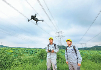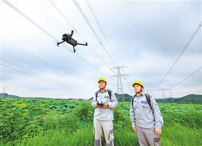 6月20日,在安徽池州,国网安徽电力运维人员运用无人机巡视特高压重要输电通道。徐乐旸摄