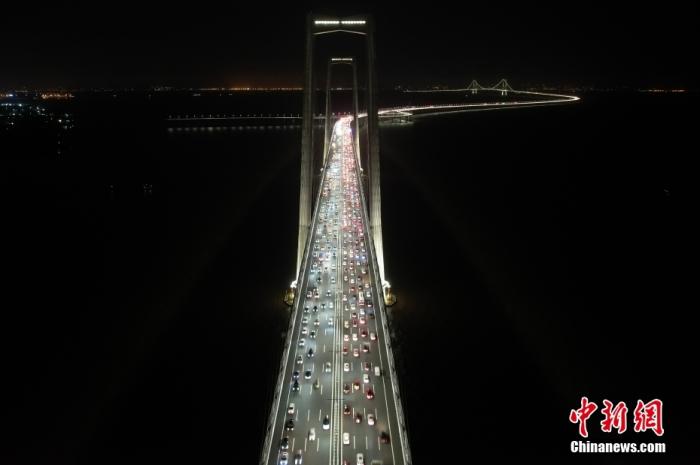 6月30日晚,广东中山,深中通道上车流密集。当日,历经逾7年的建设,粤港澳大湾区核心工程深中通道正式通车试运营。(无人机照片)中新社记者陈骥旻 摄