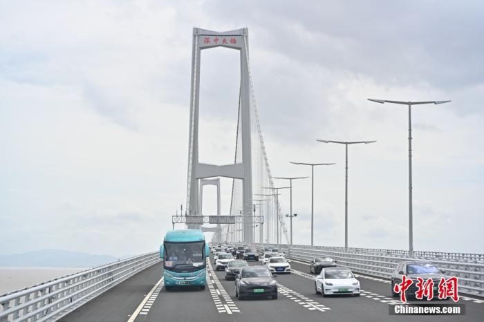 资料图:6月30日15时,历经逾7年的建设,粤港澳大湾区核心工程深中通道通车试运营。图为广东中山,车辆行驶在深中大桥上。中新社记者陈骥旻 摄