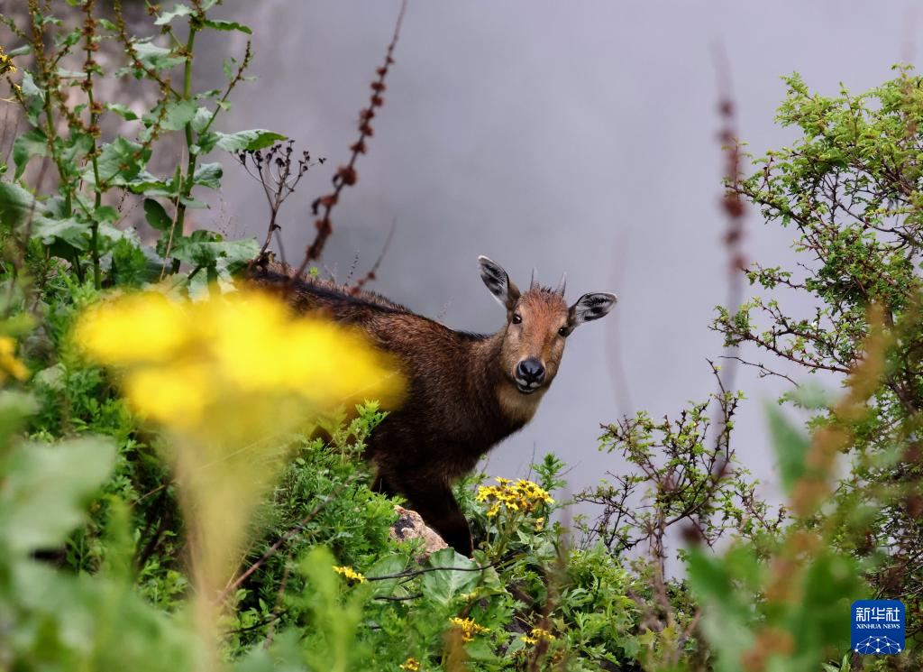 7月23日,雌性喜马拉雅斑羚带领幼崽觅食。
