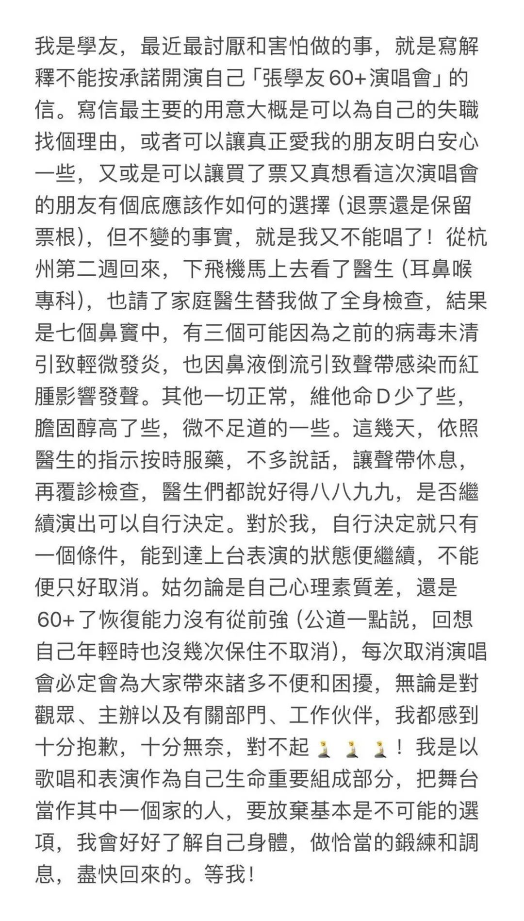 虽然这几天他有按医生指示按时服药,让声带休息,但张学友自认为觉得还未达到“上台表演的状态”,“十分抱歉,十分无奈,对不起!”