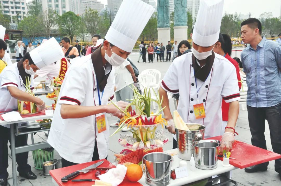 贵州省旅游学校学生在技能大赛上展示果盘雕刻技艺。