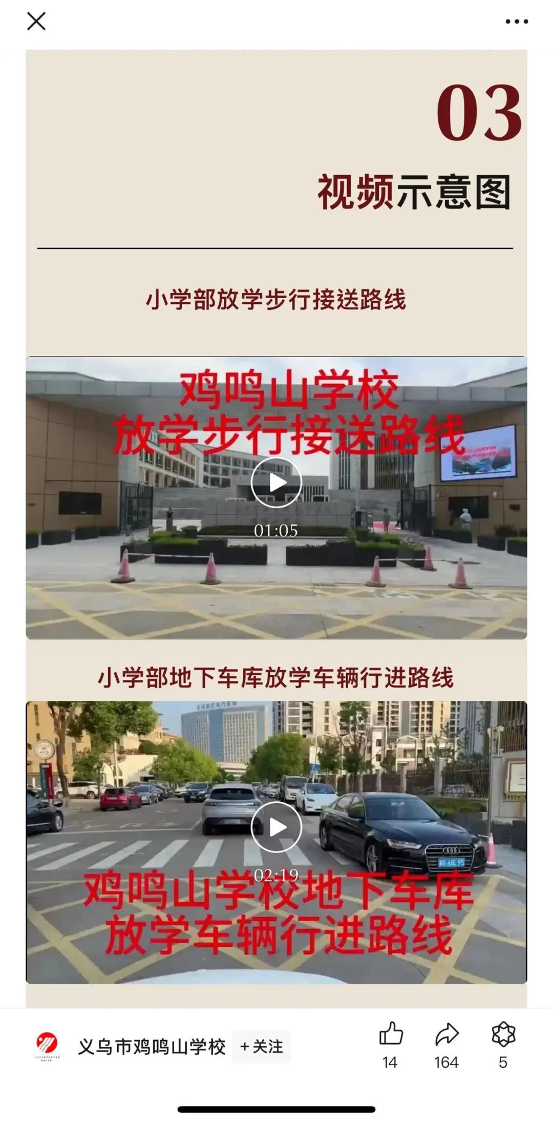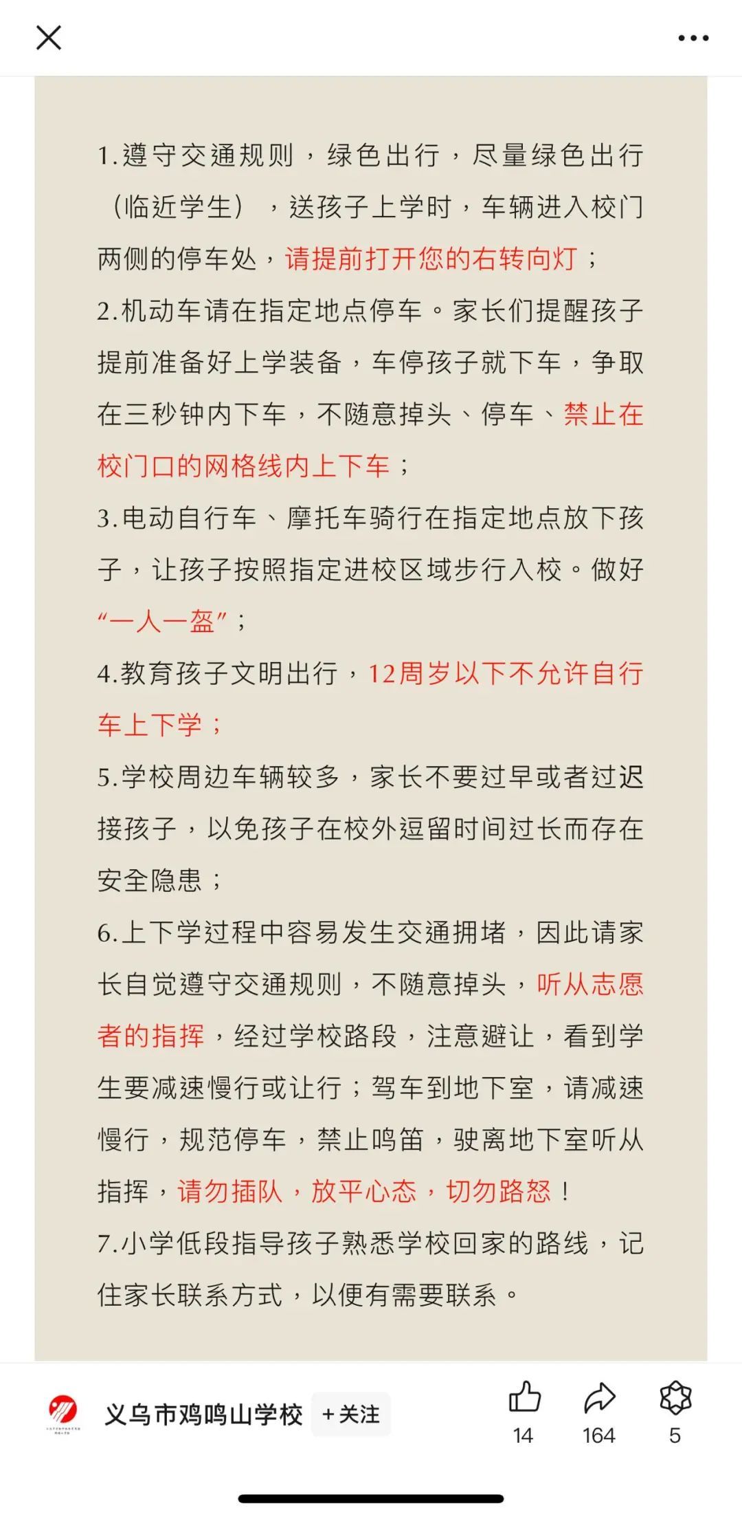 此外,记者还发现,早在9月1日开学第一天,义乌市鸡鸣山学校就在官方公众号上发布了完整的上下学接送指南。指南中不仅提到了家长们接送孩子时的注意事项,如:机动车请在指定地点停车。家长们提醒孩子提前准备好上学装备,车停孩子就下车,争取在三秒钟内下车,不随意掉头、停车、禁止在校门口的网格线内上下车;电动自行车、摩托车骑行在指定地点放下孩子,让孩子按照指定进校区域步行入校。做好“一人一盔”等等,提醒家长们做好安全准备。