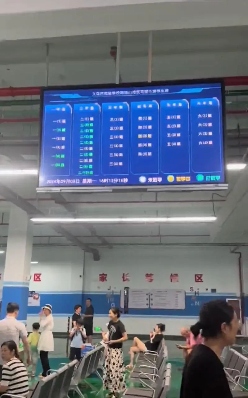 在发布的视频中记者看到,浙江义乌市鸡鸣山学校的地下停车场俨然被打造成了一个智能化“接娃基地”。停车场内设施齐备,不仅放置了许多等待休息椅供来接娃的家长们休息,还安置了电动闸机和电子大屏,在蓝色屏幕上持续滚动着一到六年级各个班级的放学信息。这样一来,家长们就能准确得知孩子的放学时间,接孩子的时候就能实现在地下车库“即停即走”,不用忍受之前长时间等待的堵车之苦。