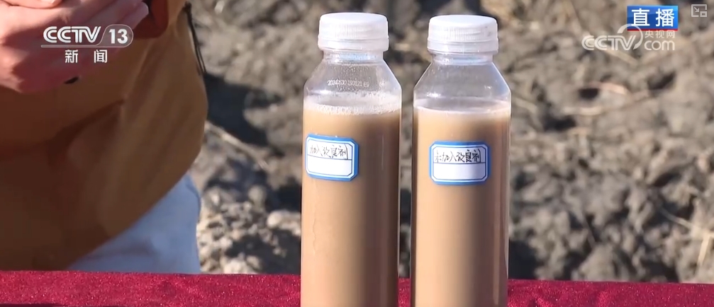这片田采用的是有机硅改良剂来治理的盐碱地,选取同地块的盐碱土溶于水中,加入有机硅后,土壤和水快速分层。可以看到,有机硅具有较强的亲土性,可以和土壤包裹一起,阻断盐分吸收,从而达到降碱和改变土壤板结的作用。这能让水稻更好地扎根生长,浑浊的水变清澈,也可以增加作物的光合作用,有效治理重度盐碱土壤。