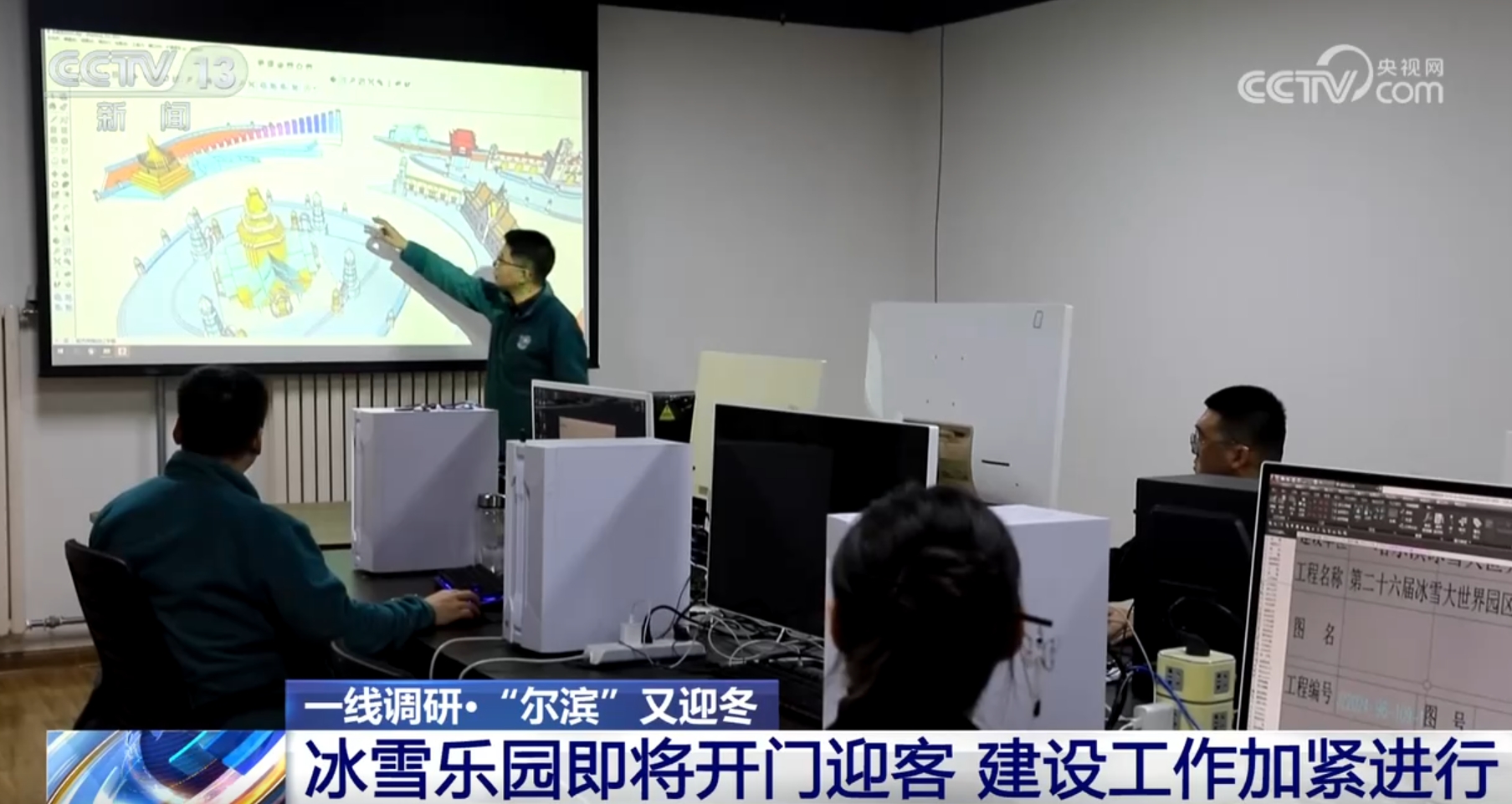 正在给团队讲解图纸的人名叫丛配玉,他负责今年冰雪大世界的整体设计,大到主舞台的视觉呈现、建筑景观和灯光设计的组合,小到手机信号塔的位置,都是他们这个团队的工作。