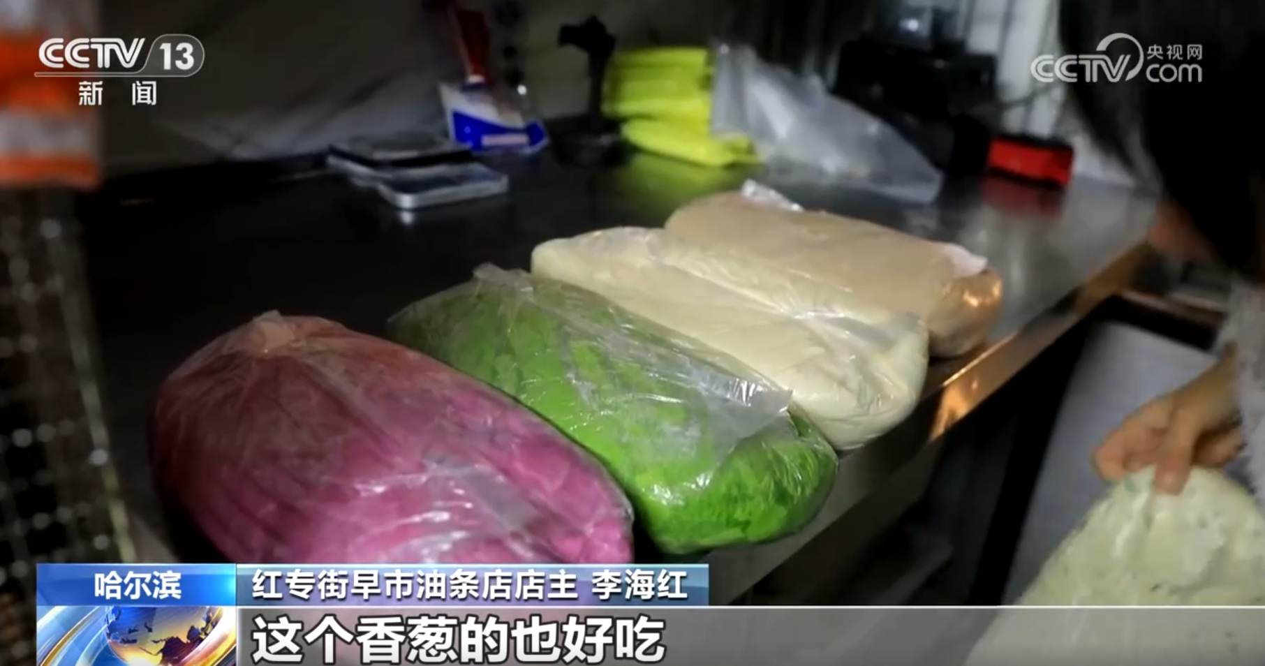 哈尔滨市红专街早市油条店店主李海红称:“每天正常的就是这个原味的,然后有巧克力的,偶尔还会有菠菜、火龙果、香葱、牛奶蜂蜜的。”
