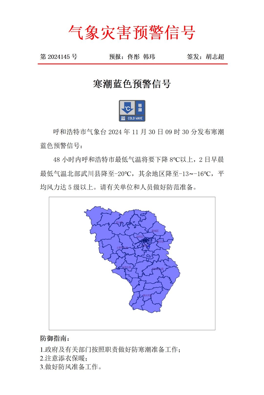 48小时内,呼和浩特市最低气温将要下降 8℃以上,2日早晨最低气温北部武川县降至-20℃,其余地区降至-13~-16℃,平均风力达5级以上。请有关单位和人员做好防范准备。
