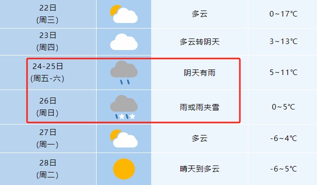 25日(周六):全省阴天。全省有小雨,其中淮北北部和大别山区部分地区夜里有小雨转雨夹雪或雪。