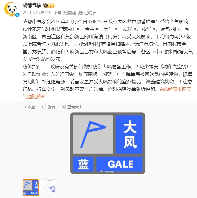 受冷空气影响,预计未来12小时成都市锦江区、青羊区、金牛区、武侯区、成华区、高新西区、高新南区、青白江区和东部新区的所有镇(街道)将受大风影响,平均风力可达6级以上或者阵风7级以上。大风影响时伴有降温和降雨,请注意防范。目前成都市金堂、龙泉驿、简阳和天府新区已发布大风蓝色预警信号,各区(市)县将根据天气发展情况适时发布。