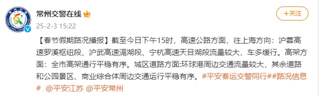 截至2月3日14:00,全省高速公路总体运行平稳,通行秩序良好。受春节假期返程影响,部分路段车流量较大,有阶段性车多缓行情况。